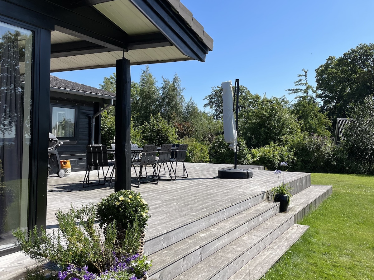 Nouvelle maison d'été privée de 2018 avec une belle vue et un emplacement que nous louons si vous voulez en prendre soin :) Tout est lumineux et accueillant. La maison est très bien située sur le terrain avec une vue fantastique sur le passage des saisons à Mols Bjerge. Il y a une grande cuisine/salle à manger et un salon avec poêle à bois, une salle de bains et trois belles chambres avec lits superposés ou doubles. Il y a une immense terrasse exposée sud et ouest autour de la maison.