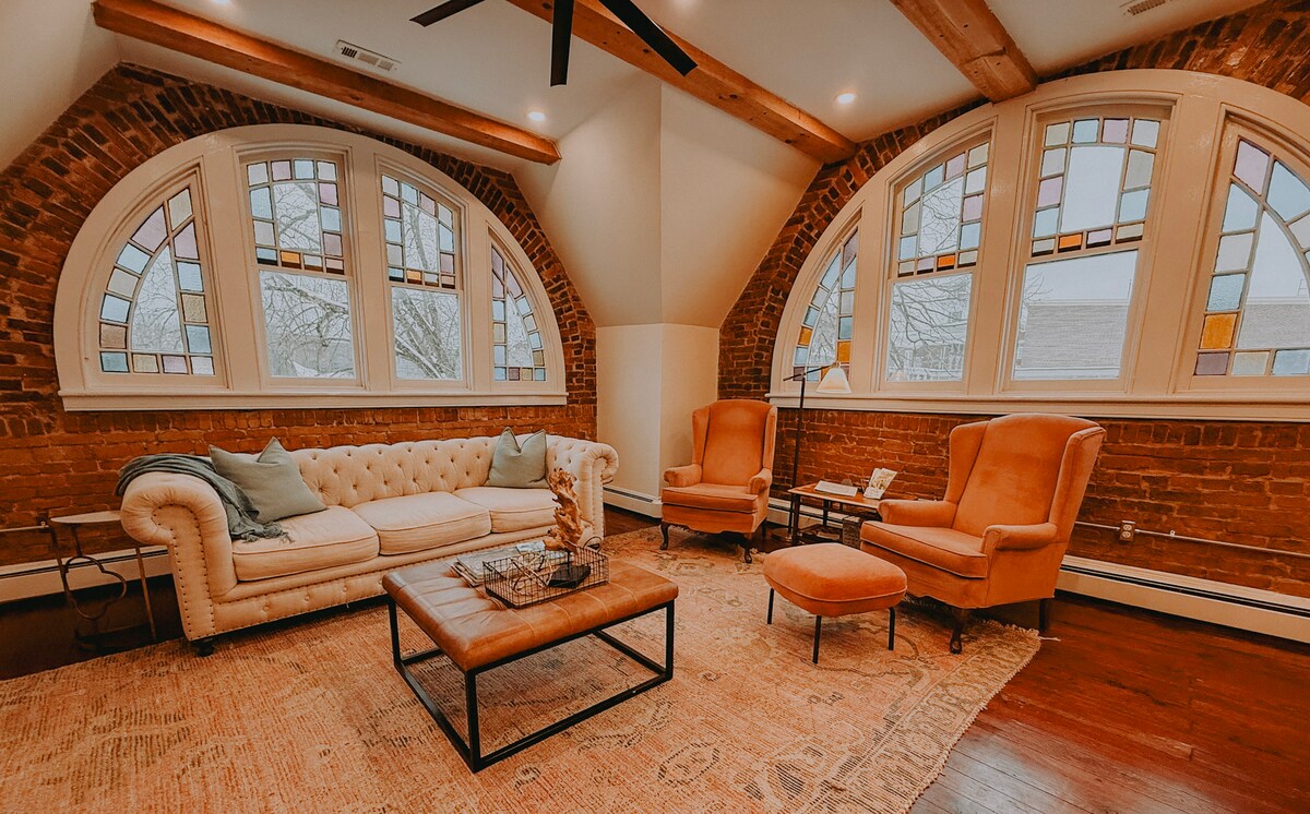 Il s'agit d'une grande suite privée au cœur du centre-ville d'Abingdon en Virginie. Situé à moins de 2 pâtés de maisons du Creeper Trail et juste sur Courthouse Hill. Il n'y a pas de meilleur emplacement pour votre visite à Abingdon ! Profitez de cette suite de luxe avec des équipements uniques tels qu'une douche à l'italienne, un lit King Size, des murs en briques d'origine et des vitraux. Réveillez-vous en surplombant Main St. dans cette ville historique et magnifique, tout en profitant de tout le luxe des équipements modernes.