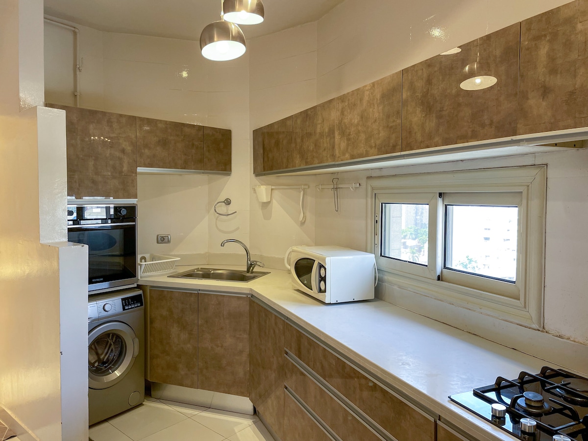 Vue sur la ville : charmant appartement confortable de 1 chambre et 1 salle de bain à Agouza. Proche de la place Tahrir, du musée égyptien, du quartier de Zamalek et à distance de marche du British Council. Terrasse de 64 m2 avec vue magnifique sur le Nil et la tour du Caire. Il est entièrement équipé avec tout ce dont vous pourriez avoir besoin, fraîchement rénové.