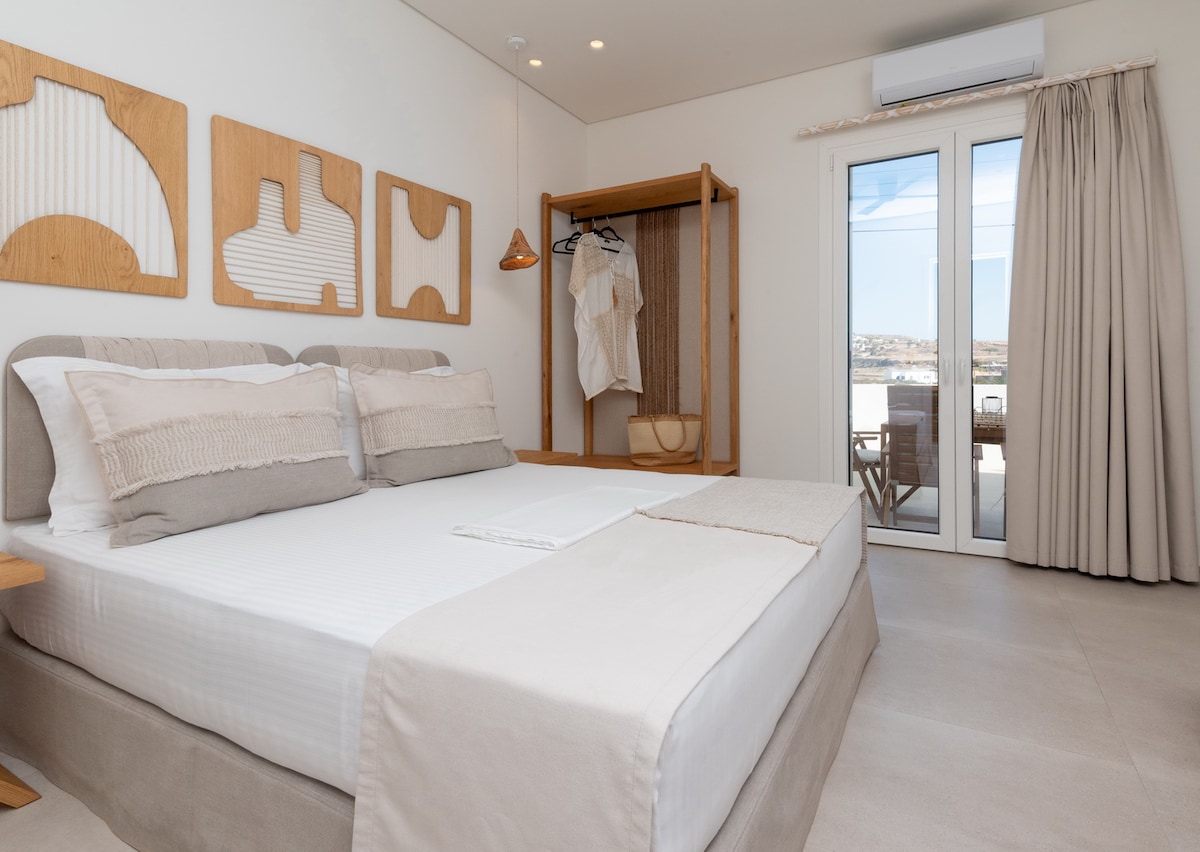 Appartement de ferme privé avec de hauts plafonds, une chambre et une salle de bain. Coin cuisine spécial, préparation du petit-déjeuner et des plats froids. 2 balcons (40 m2 au total), avec vue panoramique sur le port en face et la mer de Sarakiniko derrière (le paysage lunaire est à seulement 15 minutes à pied). Distances : à 4 minutes du port et à 7 minutes de l'aéroport en voiture. Plaka : 5 km, Pollonia : 7 km, Fyriplaka-Tsigrado en 15 minutes. Jardin récemment aménagé, environnement naturel avec intimité et tranquillité.