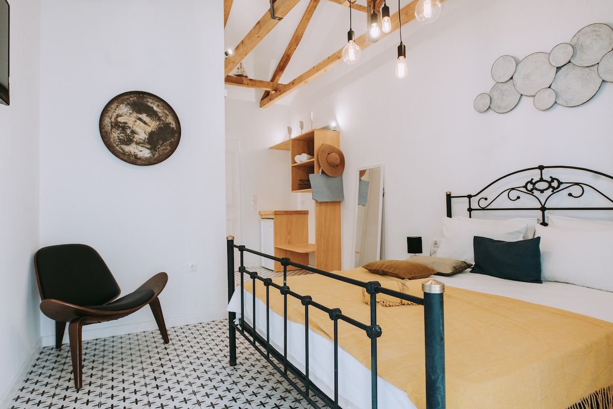 Gerofotis Suite is a very special room with a stylish & cosy sitting area with big fireplace made of marble, genuine antiques from the mansion, desk, leather couch. The views to the sea and the wineries around is something you will never forget.