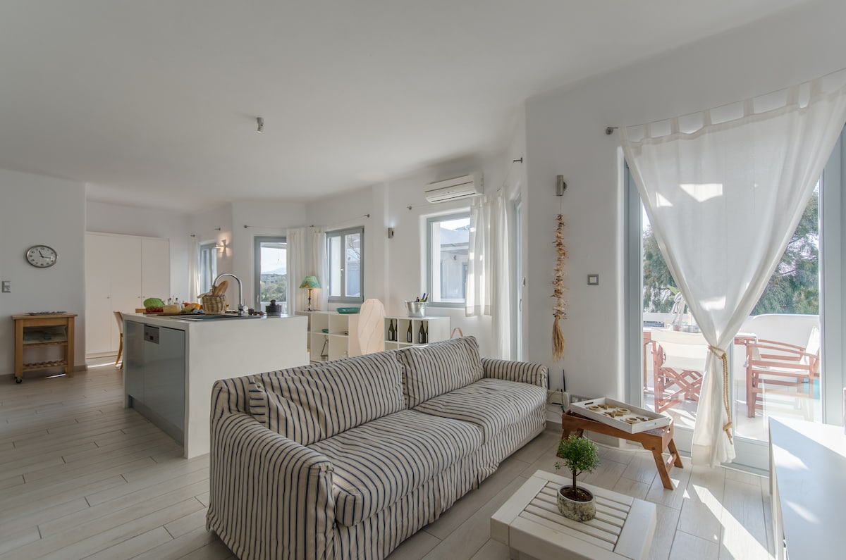Située au dernier niveau d'un grand jardin méditerranéen, Vista Ariadne est un joyau caché avec une vue incroyable sur la mer et le coucher du soleil. Confortable et isolé, c'est l'endroit idéal pour se détendre loin de la foule mais à 5' de la ville de Naxos. Ses immenses baies vitrées et sa grande terrasse privée - sans personne d'autre à proximité - offrent des vues fascinantes sur la mer Égée bleue cristalline, la plage d'Agios Prokopios et l'île de Paros. Vista Ariadne est le secret que vous ne voudrez pas partager, il sera donc entièrement à vous à votre retour.