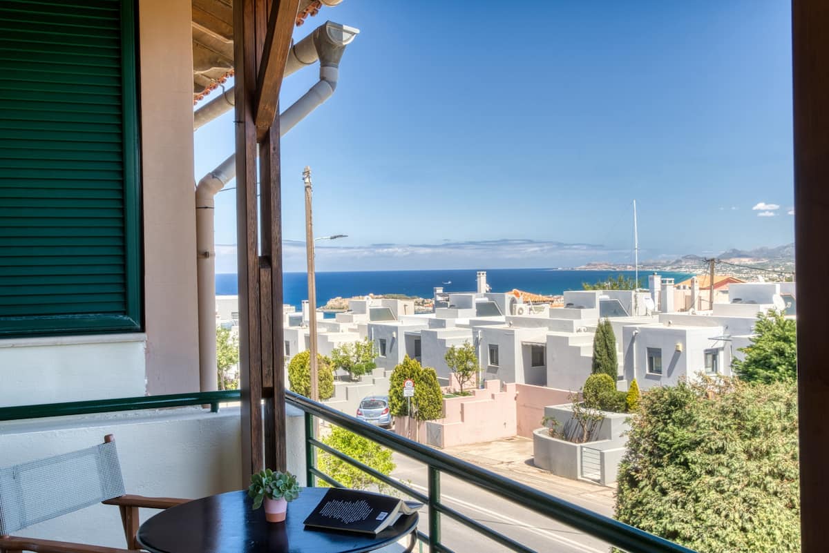 Ce studio de luxe récemment rénové avec une vue panoramique imprenable sur la mer et le coucher du soleil, est situé au sommet d'une petite colline dans un quartier calme, avec un parking gratuit dans la rue. La vieille ville est à 12 minutes à pied. Il dispose d'un espace ouvert (chambre - cuisine) et d'une salle de bain d'environ 27 m² entièrement équipée. Vous êtes autorisé à utiliser tous les espaces de l'hôtel de luxe adjacent MACARIS SUITES & SPA en commandant un repas ou une boisson.