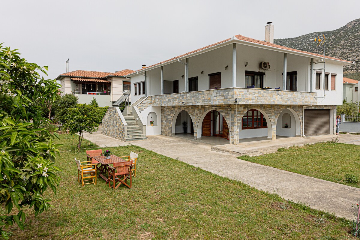 Maison de deux étages avec loft, 108 m² construite en pierre et bois dans le premier village de Pélion, Agria. À 80 mètres de la plage, à 7 km du centre de Volos et à 19 km du centre de ski de Pélion. Barbecue extérieur en pierre pour les journées ensoleillées et cheminée à l'intérieur pour les journées froides.