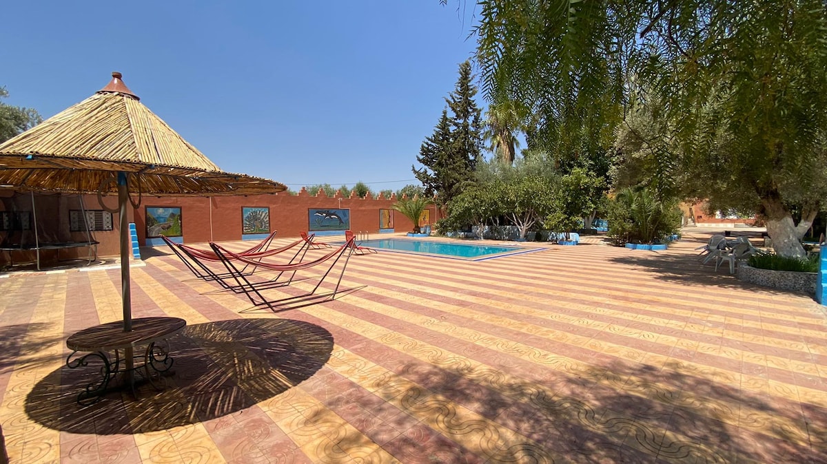 Charmante maison récemment construite et décorée style berbère sans vis-à-vis avec une vue panoramique sur les montagnes de l’Atlas et le majestueux lac de Bin El Ouidane,et une pescine .Composée de 5 chambres,toilette avec douche et 1 grande salons,cuisine entièrement équipée, climatisation,cheminée, et télévision, un grand jardin comportant 6 terrasses avec tables pour des repas en plein nature permettant de jouir du panorama tout en étant à l’ombre, un hamac pour la détente, balançoire