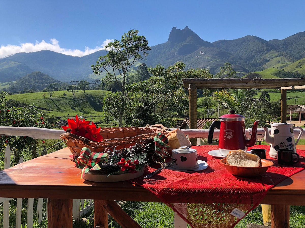 Mon logement est un tout nouveau chalet confortable, avec une cuisine équipée, une salle de bain et un balcon au premier étage, et au deuxième étage, une chambre avec un lit double et un lit simple et une terrasse avec une vue incroyable... Nous sommes à 36 km de la ville d'Itamonte. Venez vous reposer et vous détendre au milieu de la nature et des montagnes de Mantiqueira. Et nous sommes à 17 km du parc national d'Itatiaia, en haut des Agulhas Negras. Et à proximité de plusieurs belles cascades de la rivière Aiuruoca.