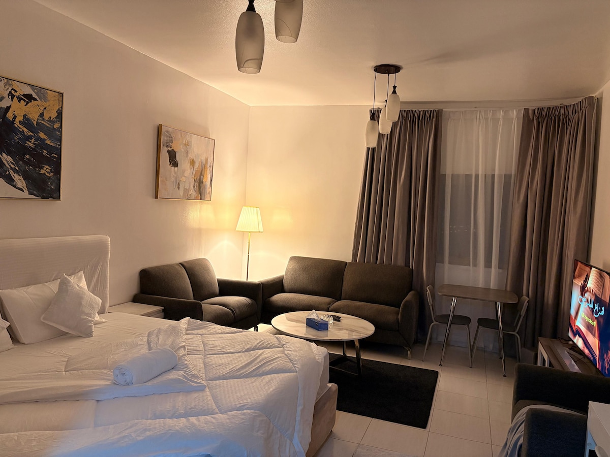 Studio de luxe flambant neuf à Ajman One Towers avec vue imprenable sur la mer et à quelques pas de la plage. Le studio est entouré de restaurants, de cafés et de tous les produits essentiels du quotidien. Entièrement équipé pour des séjours courts ou longs. - Wi-Fi rapide - Climatiseur. - Cuisine équipée - Salle de bain entière - Lit King Size - Téléviseur connecté de 60 pouces - Canapé - Bureau de travail - Table à manger - Robe - Tenue ; - Banc à bagages