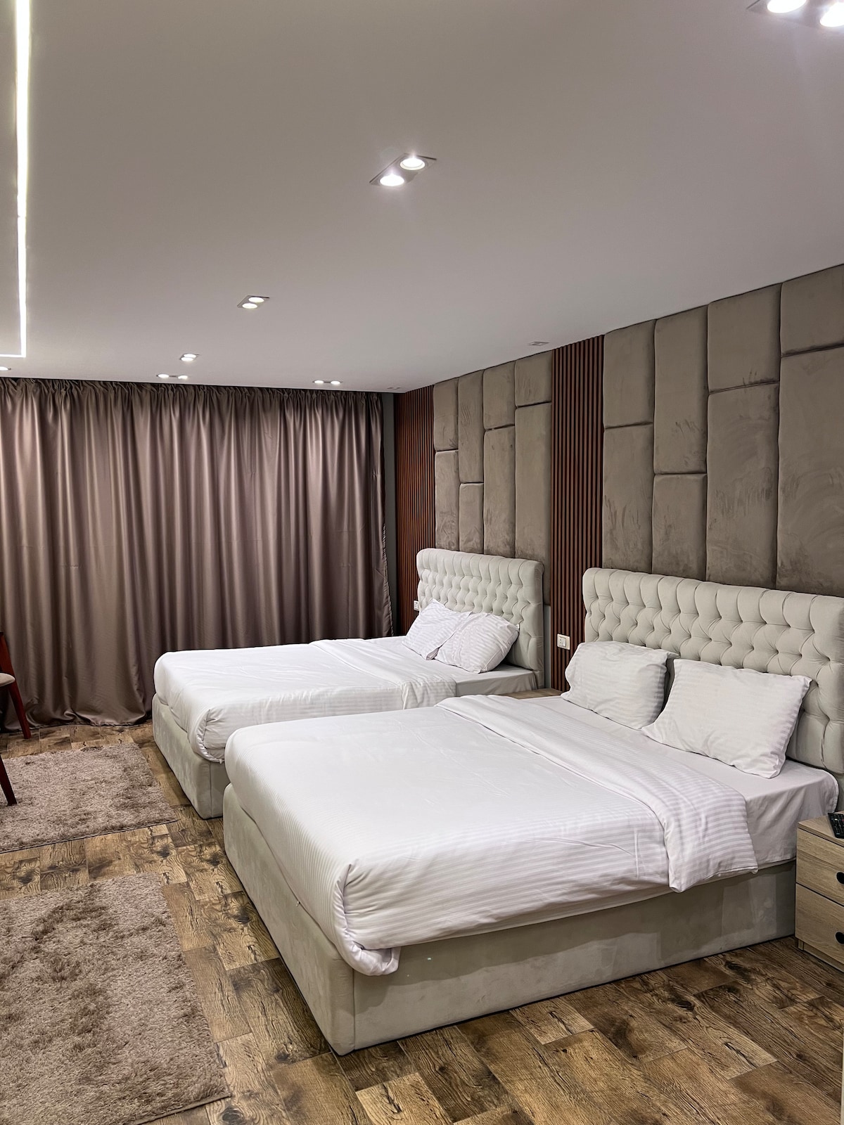 A bedroom with a large en-suite bed (195 × 205 cm) and small room with a sofa bed (140 × 200 cm), plus an additional bathroom with shower. • Supermarket just a few minutes away • Filtered drinking water provided Cooling & heating: • A/C available in the living room at €3 per night • Fans provided free of charge in the bedrooms • Portable heater available at €3 per night ❌ No Wi-Fi — please arrange a local SIM or eSIM with data on arrival.