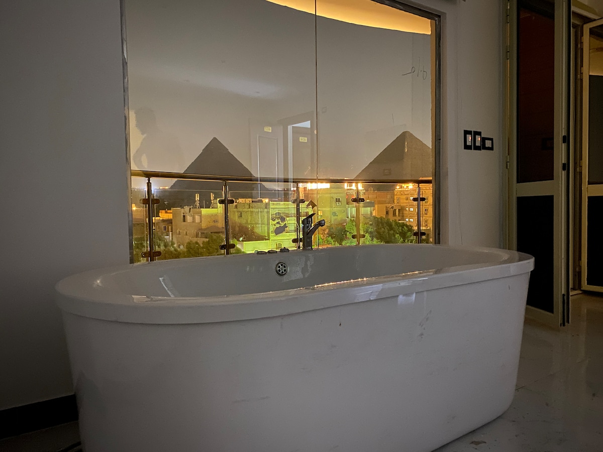 Imaginez-vous vous réveiller avec une vue imprenable sur l'une des merveilles du monde. Notre appartement vous place au cœur de tout. D'un côté, profitez de la vue nocturne majestueuse sur la grande pyramide de Gizeh, de l'autre, de la verdure sereine d'un parcours de golf luxuriant. L'appartement est géré par un hôtelier expérimenté qui comprend le vrai sens du confort et de l'hospitalité. Niché dans un quartier calme à l'abri du bruit de la rue,