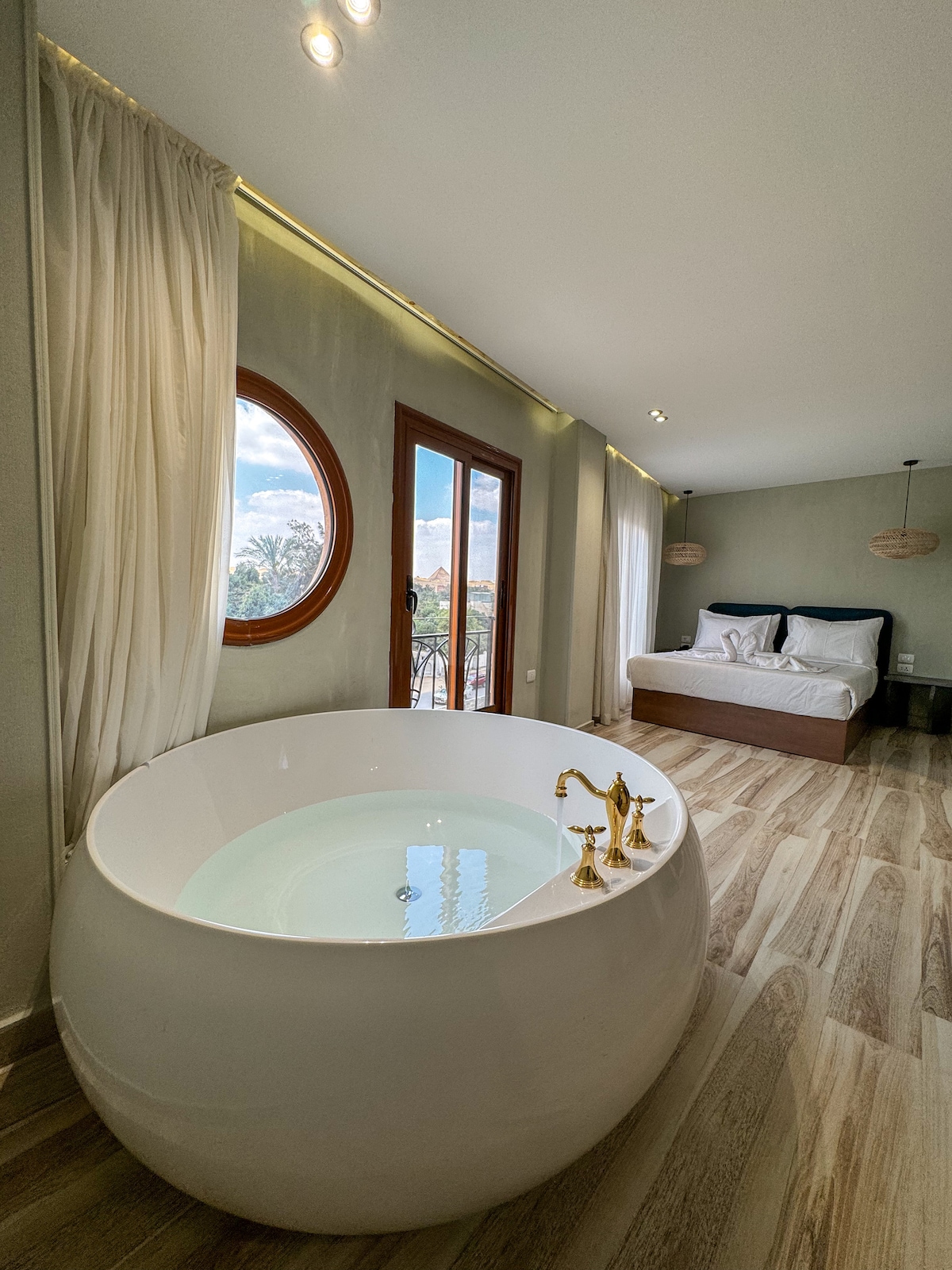 Suite avec lit King size et vue sur la piscine et les pyramides