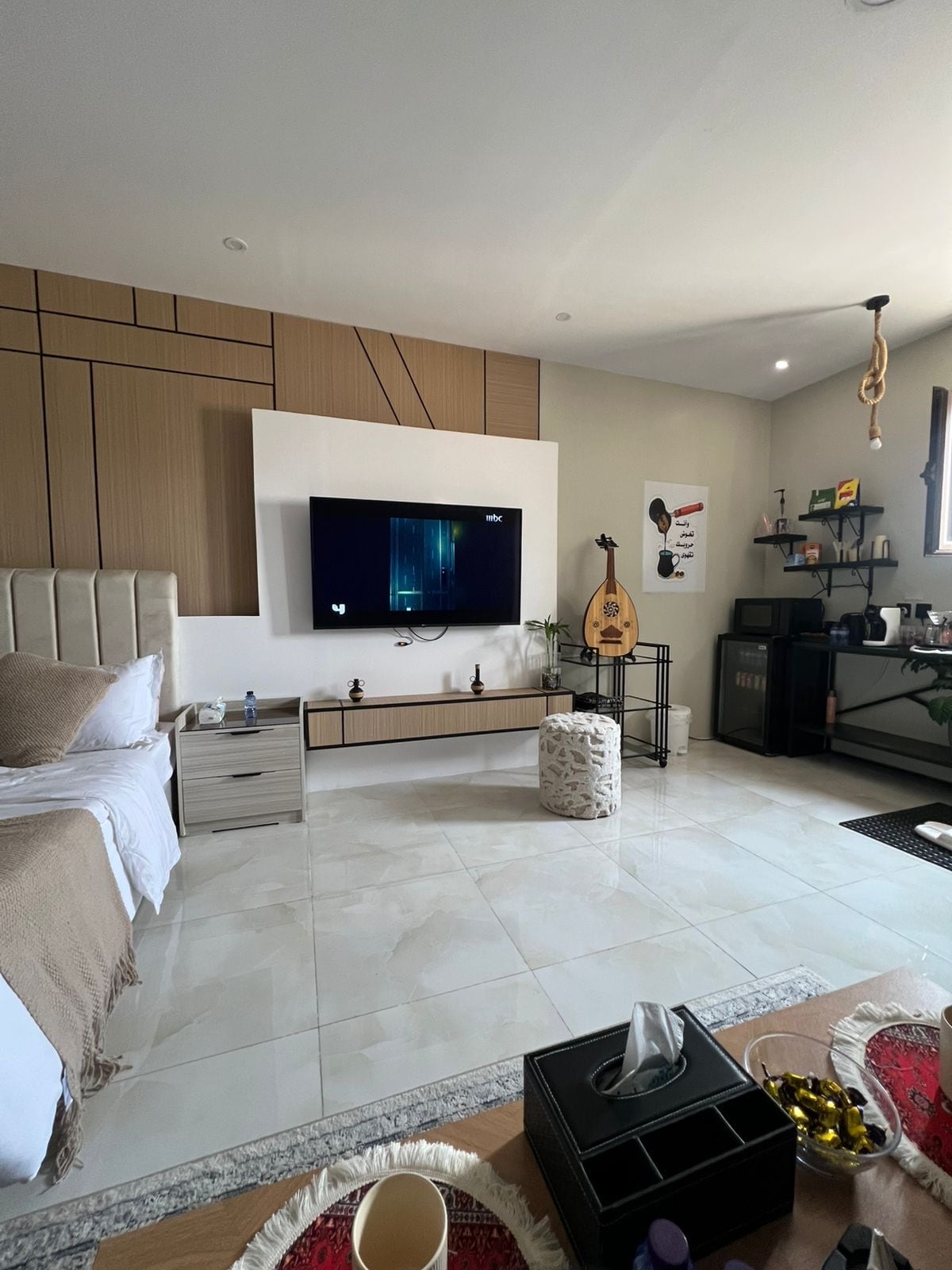 Profitez d'une expérience unique dans une chambre privée qui offre détente et confort. L'appartement comprend un lit et un salon où vous pourrez regarder un écran intelligent de 55 pouces. Il y a aussi une cuisine et du café pour répondre à tous vos besoins. Chambre d'hôtel avec entrée intelligente et design confortable À 5 minutes à pied du centre commercial Al-Ahsa À 5 minutes à pied du parc du Roi Abdallah À 10 minutes en voiture de l'Université Roi Faisal À 10 minutes en voiture de la faculté des arts À 10 minutes en voiture de l'aéroport international d'Al-Ahsa À 15 minutes en voiture de la gare Les cafés sont proches des restaurants Studio au design confortable Finition de luxe