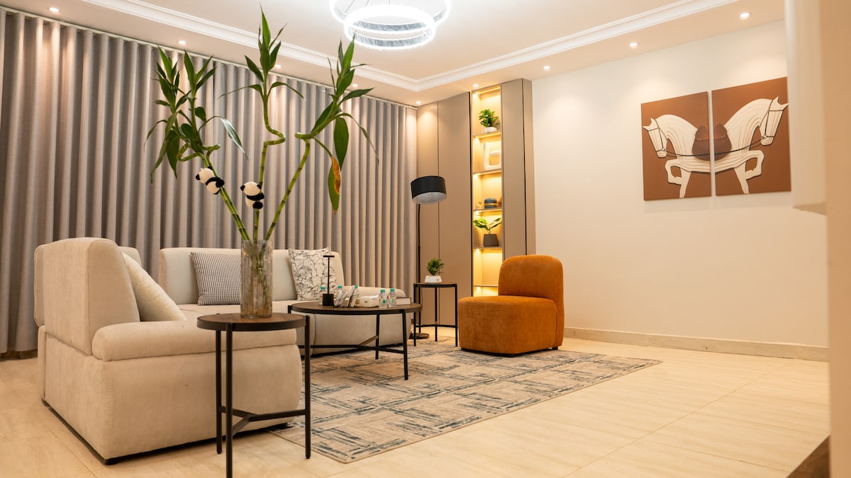 Une pause hôtelière confortable et auto-entrée sans réception avec deux chambres, un salon, une cuisine, deux toilettes, une table à manger, une séance en plein air avec une cuisinière, une entrée de voiture et tout ce dont vous avez besoin : une télévision, un réfrigérateur, un lave-linge, un four à micro-ondes, une cafetière, un thé, une bouilloire et toutes sortes de désodorisants des bougies, de l'encens et de la couronne, ainsi que tout ce dont vous avez besoin, des articles de soins personnels « Brush, pasta, shampoing, après-shampoing, éclaireurs et serviettes » pour devenir l'une des meilleures options après une longue journée de travail, et passer les heures de la nuit avec confort et loisirs jusqu'au lendemain.