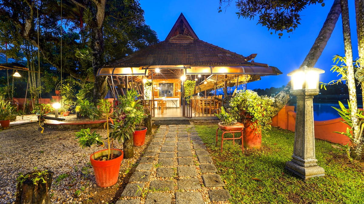 ◆Set beside the peaceful backwaters, this riverside retreat offers a quiet escape woven with tradition & nature. ◆The open-air restaurant, shaded by sloping tiled roof, offers scenic riverside dining throughout the day.◆The suite features an open-to-sky bathroom with stone-clad walls, pebbled flooring & amenities.◆For those eager to discover more, kayaking, houseboat rides, shikara cruises, speed boat adventures, and cycle rentals can be arranged at an additional charge.