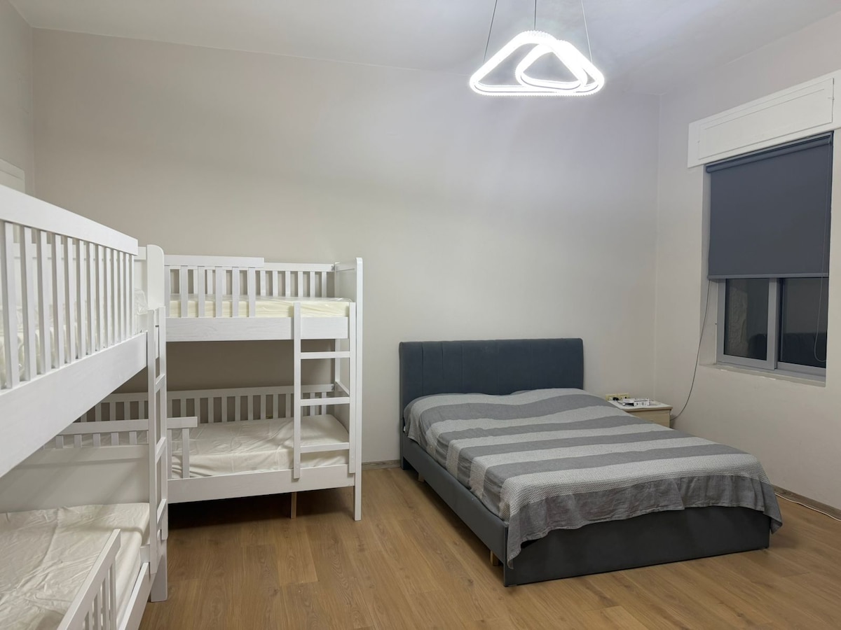 Dortoir partagé, peut également être transformé en chambre privée. Chambre spacieuse et lumineuse dans une auberge conviviale et calme. Peut accueillir jusqu'à 4 personnes pour des amis ou de la famille. Le lit principal est polyvalent, peut être 2 lits simples ou 1 lit double queen size, les 2 autres lits sont dans un lit superposé. La salle de bain sera partagée mais est très proche de la chambre. Nous avons également beaucoup d'espaces communs comme un patio avec des canapés confortables, un coin salon, une cuisine commune à votre usage.