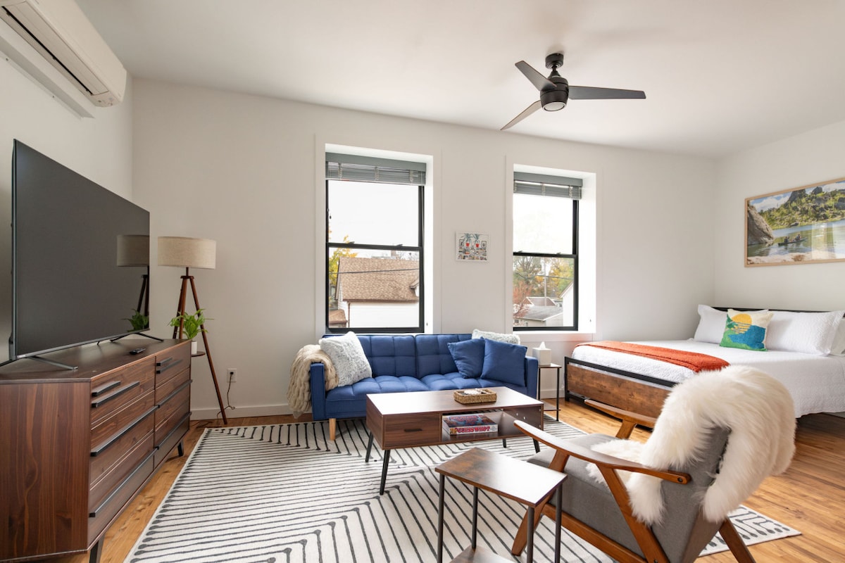 Bienvenue dans notre suite King, située au niveau du jardin inférieur de notre triplex moderne du milieu du siècle. *Ce logement dispose d'une chambre king size et d'un lit gigogne dans le séjour. *La cuisine entièrement approvisionnée offre tout le nécessaire pour des aventures culinaires. *L'intérieur élégant crée une atmosphère sophistiquée. *Le logement dispose d'un parking hors de la rue. Réservez un séjour exceptionnel avec notre équipe réactive de Superhôte à The King Suite dès aujourd'hui !
