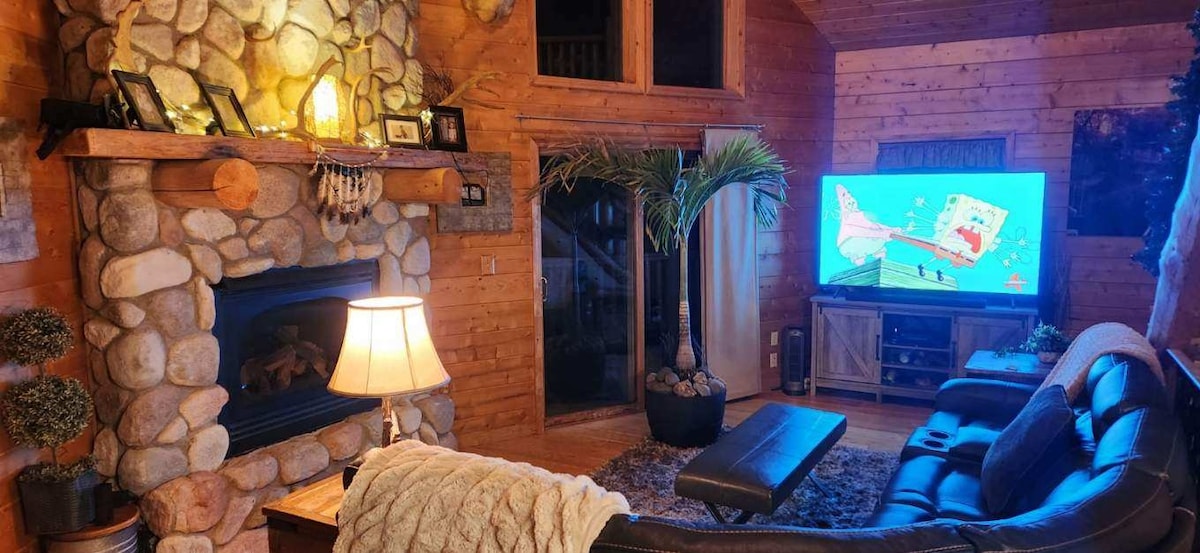Profitez de belles vacances rustiques de luxe dans un lodge privé avec un bain à remous donnant sur le lac, une piste de motocross pour les jeunes, un grand port de voiture, un porche et 2 patios donnant sur le lac. À l'intérieur, vous pourrez profiter du salon central et confortable avec une cheminée, un canapé spacieux et une télévision Samsung de 70 pouces avec son surround, un total de six téléviseurs intelligents dans toute la maison. Le rez-de-chaussée comprend un bar, une deuxième cuisine, un lit de bronzage et une salle de jeux avec une table de billard, des fléchettes et du ping-pong. (Fumeur autorisé)
