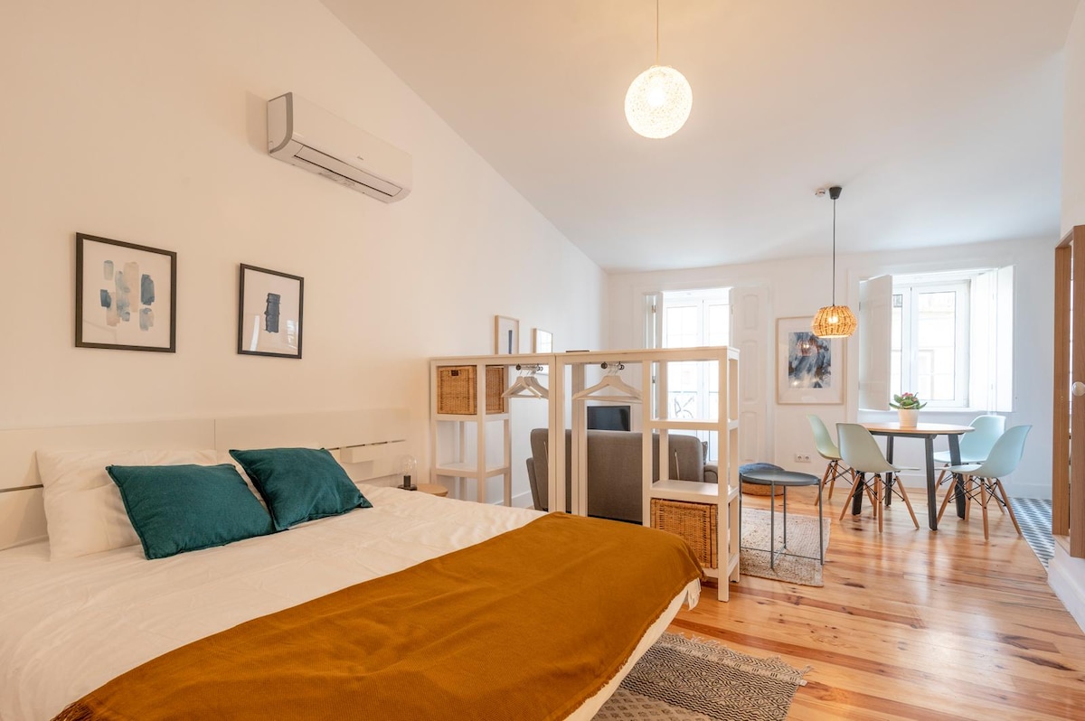 New apartment fully renovated, equipped with air conditioning and heating, it's located in the heart of Alfama district. This bright and beautiful apartment, 3rd floor, is great for Couples and Friends! Combines a cozy atmosphere, nice decor and modern amenities. Can fit up to 3 people (4 people with young kids u13), divided by 1 room with double bed, and a sofa-bed in the living room.