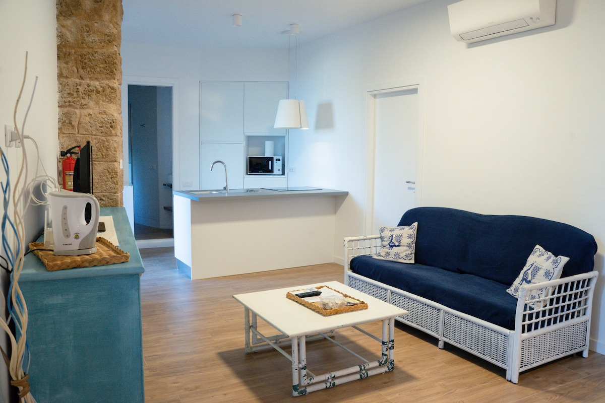 L'appartamento è un accogliente bilocale di 60 mq, modernamente arredato ed accessoriato. Si trova al TERZO PIANO di una palazzina, SENZA ASCENSORE. E' composto da sala con angolo cottura; 1 camera da letto matrimoniale; 1 bagno con box doccia. E' provvisto di lavatrice, lavastoviglie, forno elettrico, a microonde, frigo, freezer, climatizzatori. E' situato a 50 metri dal mare e a pochi passi dal centro storico.