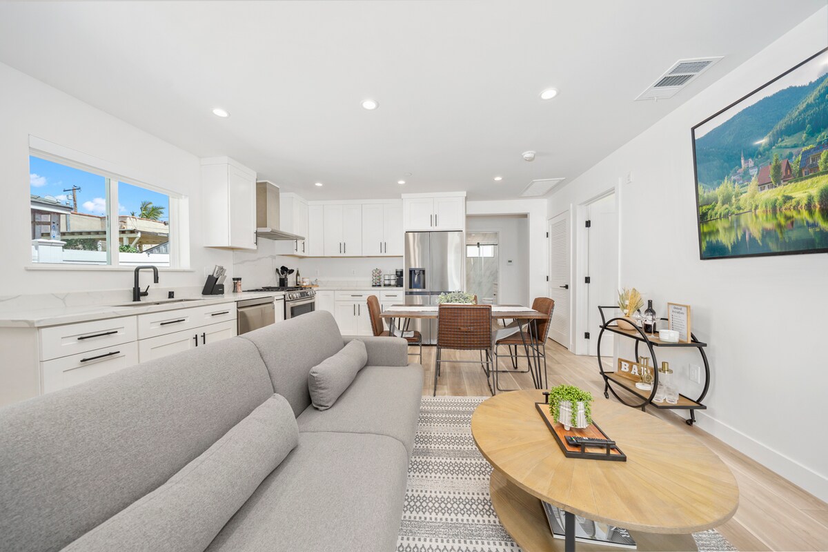 This 1-bedroom/1-bathroom house was built in the early 1940s, its decor is a nod to that era's timeless charm. Blackout drapes enhance the sleeping areas for a restful night's sleep. The beverage bar features ample cabinetry, an accent wall with backsplash, and unique open live edge shelves, crafted from the old avocado tree that once graced the patio. The patio has since been transformed with outdoor furniture, making it perfect for leisurely moments outdoors.