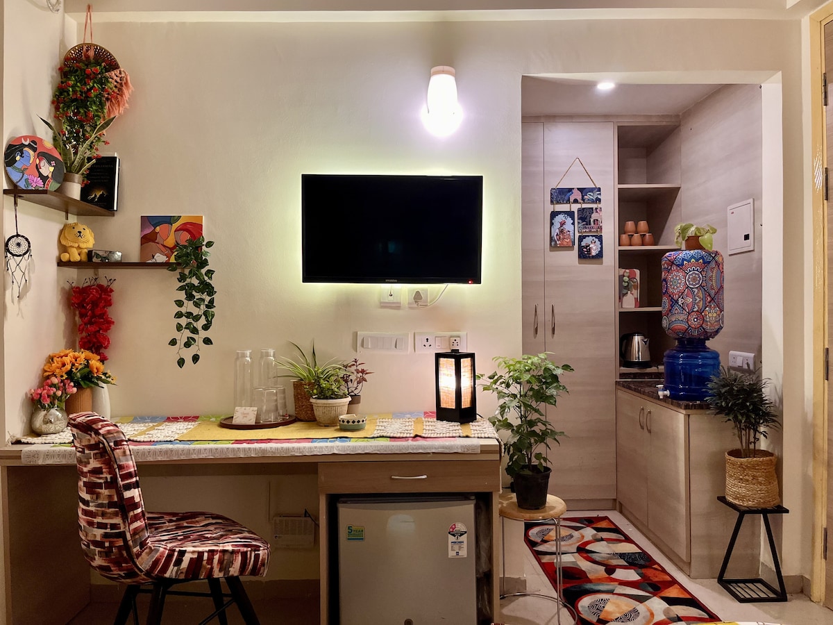 Radhey Radhey Retraite familiale paisible et artistique à Vrindavan Studio conçu avec goût, alliant héritage indien et confort moderne À seulement 10–15 minutes de Prem Mandir, ISKCON et du temple Banke Bihari Des intérieurs calmes et profonds, idéaux pour la détente ou le ressourcement spirituel Balcon confortable donnant sur un jardin paisible, parfait pour le thé du matin ou la méditation Convient aux familles et aux couples à la recherche d'une escapade paisible Des prix abordables pour un séjour confortable et enrichissant 400 ₹ de plus pour le 3e adulte