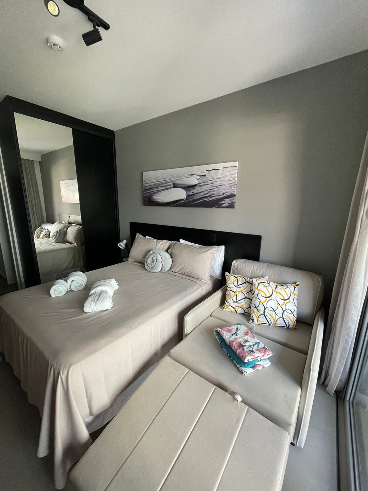 Studio de 40 m2 aconchegante com vista e localização privilegiada. Varanda com vidros e persianas blackout, sofá cama king, lençóis macios e cheirosos de 200 fios , secador de cabelos TAIFFY ,mesa, cadeiras e uma linda vista. Cozinha equipada: geladeira, forno elétrico, fogão, micro-ondas, cafeteira e liquidificador. Taças de espumante, vinho, água e cerveja .Pratos, xícaras, talheres e uma bancada para refeições. Smart TV, ar-condicionado, Wi-fi, vaga garagem e Self check-in😀