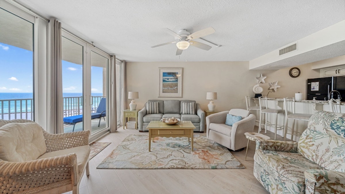 Appartement récemment rénové d'une chambre et deux salles de bain - 4 couchages. Résidence en bord de mer sécurisée. Piscine et jacuzzi fabuleux. Calme et peu fréquenté. À distance de marche d'excellents restaurants, boutiques et activités amusantes. Le magnifique parc d'État de St. Andrew avec un ferry pour l'île aux coquillages se trouve juste en bas de la route. Marinas à proximité. De plus, nous voyons des dauphins ici tout le temps, sans parler des magnifiques couchers de soleil... Nous pensons donc que c'est le meilleur endroit sur la plage ! Équipement de plage fourni + un chariot pour un transport facile. Détendu et groovy ! 😎
