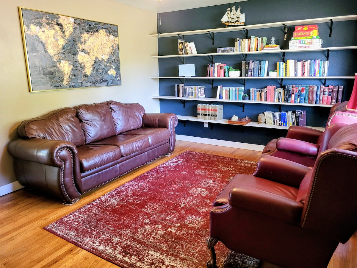 Profitez d'un séjour paisible dans notre suite privée au sous-sol. Vous apprécierez les hauts plafonds, la lumière naturelle et l'observation de la faune dans notre jardin ! Entrée privée depuis le patio arrière et parking hors rue pour 1 voiture. Comprend : 1 chambre avec lit queen, salle de bain avec douche/baignoire, cuisine complète, salon avec canapé futon, matelas au sol et pack 'n play. Demandez des conditions pour les animaux de compagnie avant de réserver. Si vous êtes intéressé par une date bloquée, envoyez-moi un message (nouvel emploi=moins de disponibilité à la semaine). Réduction de 10 % pour les éducateurs🏫❤️.