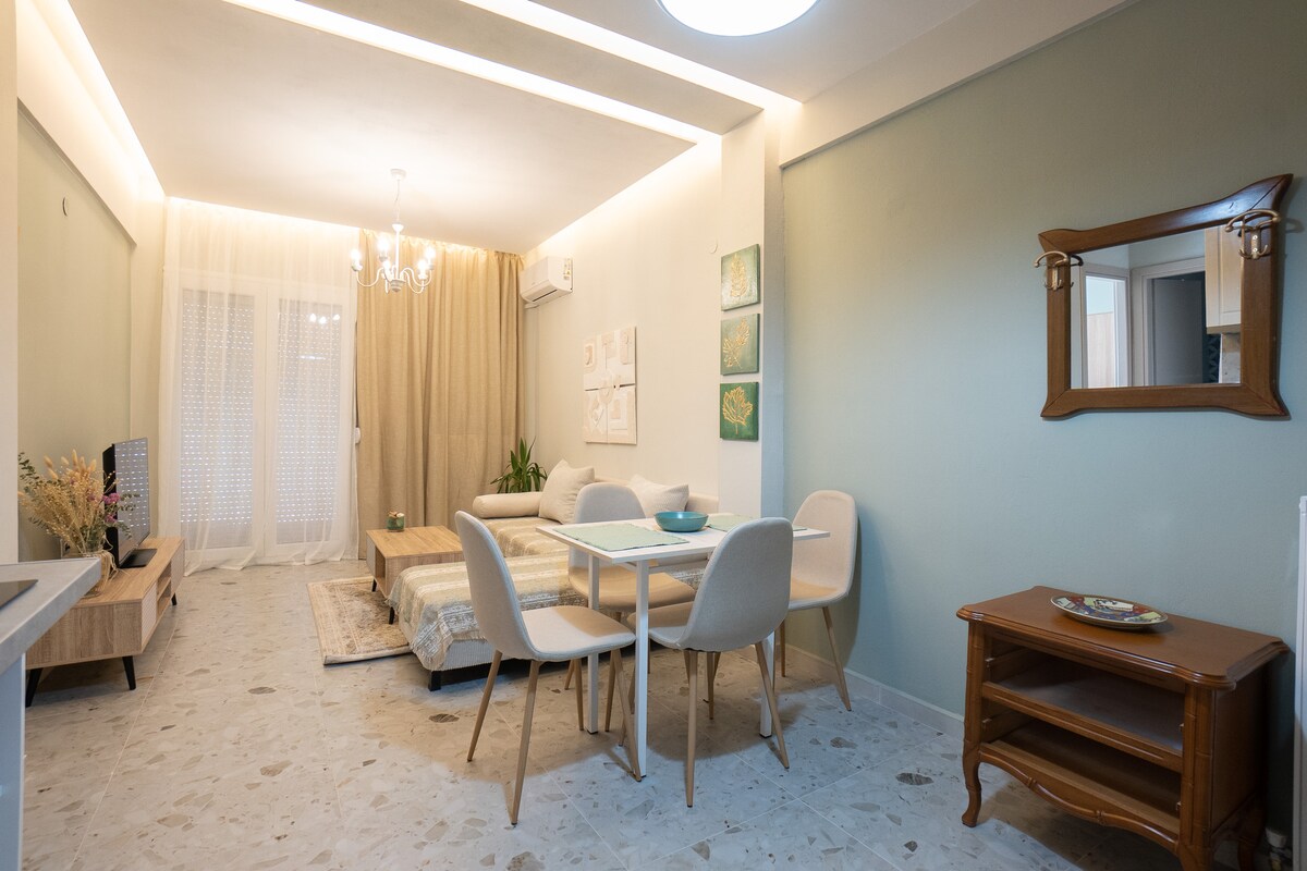 Profitez d'un séjour relaxant dans notre appartement rénové (2024) et élégant situé à la périphérie du centre de Thessalonique. L'appartement est accessible à pied (10-15min à pied) de certains des quartiers les plus célèbres de la ville. À 1 km du quartier de Ladadika (tavernes locales, restaurants, pubs et clubs) À -1,2 km du bord de l'eau À -1,5 km de la place Aristotelous (place principale de la ville) - 350 m de la gare centrale/arrêt de métro (nouvelle gare ferroviaire - Νέος Σιδ. Σταθμός)/X1 arrêt de bus de/vers l'aéroport
