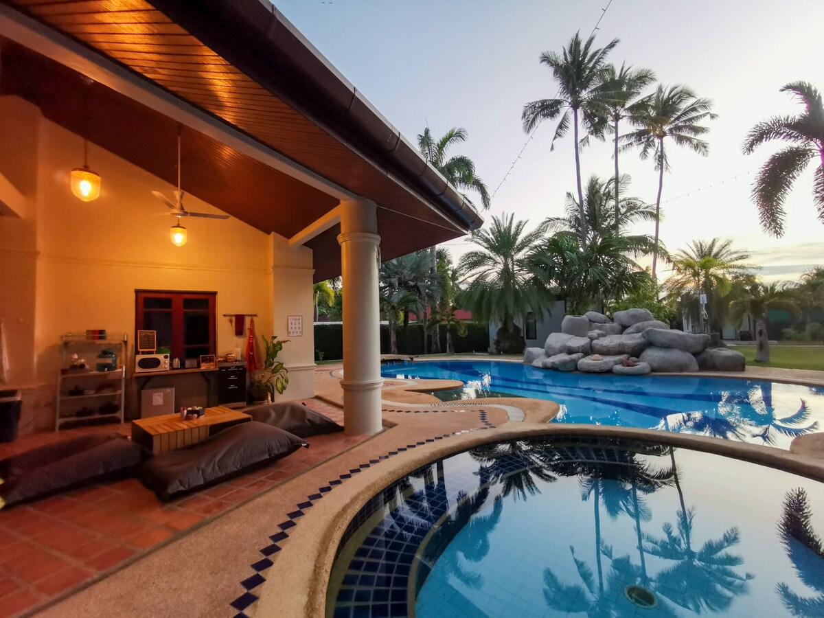 Bienvenue à The Tropical Hideaway, un bungalow élégant de taille moyenne sur une propriété fermée avec deux autres bungalows et une villa principale. La piscine et le jardin sont partagés. À l'intérieur, vous trouverez un salon confortable avec de la lumière naturelle et une décoration d'inspiration thaïlandaise, une kitchenette, une chambre spacieuse avec un éclairage doux et une salle de bain avec un bain à remous. Profitez de votre terrasse en bois privée avec chaises longues, idéale pour prendre votre café du matin ou un verre au coucher du soleil. Idéal pour les couples, les voyageurs en solo ou les nomades numériques en quête de paix.