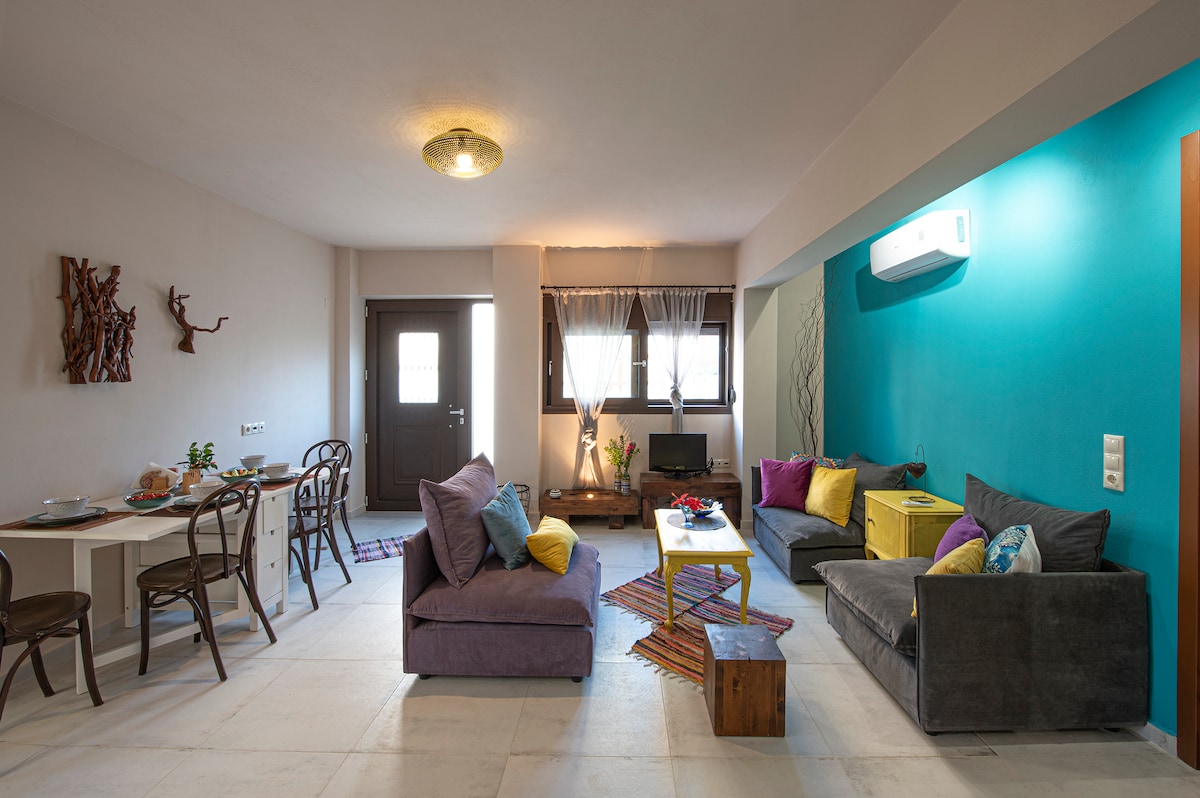 Bienvenue à la Colored Dreams House. Un sanctuaire de couleurs et de lumière situé sur un terrain de 2 000 m² avec des oliviers et des fleurs dansant dans la brise. Naturellement éclairé toute la journée, il vous invite à vous détendre ou à travailler en toute tranquillité tout au long de l’année. Du jardin à la montagne et à la mer qui s'étend à l'horizon, chaque instant est une invitation à la tranquillité et à des souvenirs inoubliables. À seulement 5 minutes en voiture, vous trouverez des plages dorées, des tavernes traditionnelles et des cafés pour savourer la vie locale.
