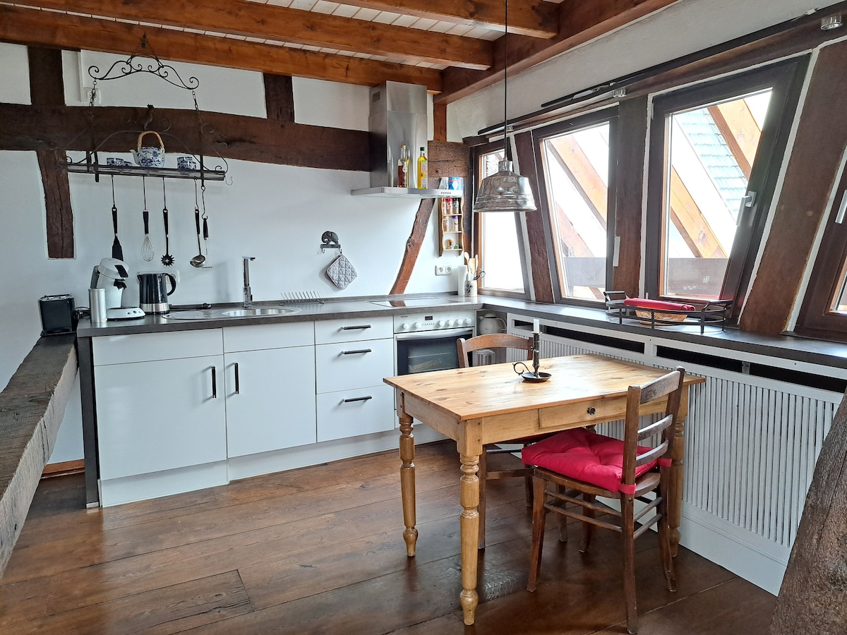 La maison à colombages est située dans la cour de l'ancien presbytère de Kirmutscheid/Wirft à seulement 5 minutes du Nürburgring. La maison principale a été construite en 1709 par le baron Gallen zu Assen pour le prêtre et est directement adjacente à l'église qui a été construite par le comte Ulrich de Nürburg en 1214. La maison avec environ 50 m ² d'espace de vie a été restaurée avec une grande attention aux détails et rénovée uniquement avec des matériaux de construction naturels afin de ne pas perdre le climat intérieur agréable.