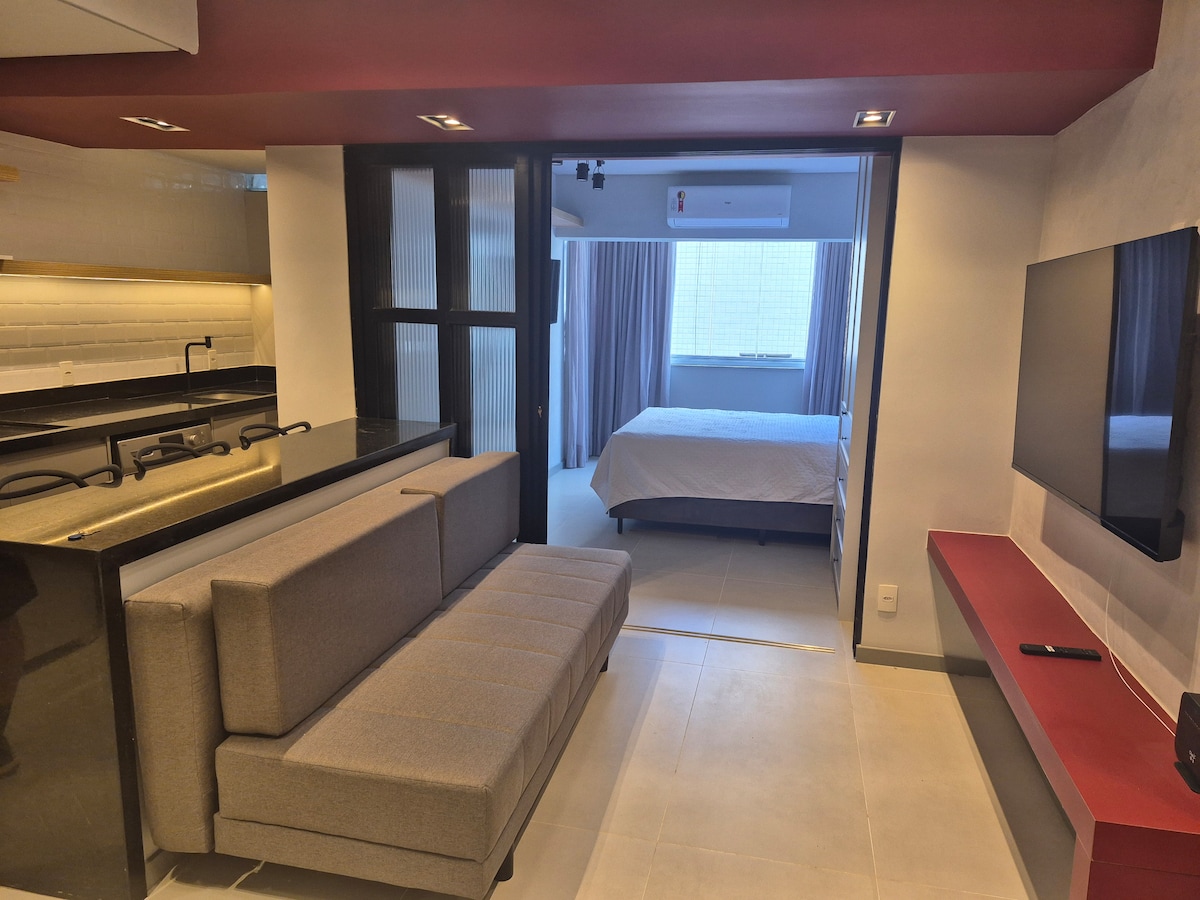 Détendez-vous dans cet espace calme et élégant. Restez à proximité de tout à Santos ! Appartement entier rénové pour votre confort ! Marchez jusqu'à la plage, le shopping, le cinéma, le supermarché et tout ce dont vous avez besoin ! L'espace est idéal pour 4 personnes. Le linge de lit et de bain est disponible. Dans la chambre, détendez-vous dans un grand lit queen size d'hôtel, avec climatisation et télévision 43". Dans le salon, il y a un canapé-lit double, la climatisation et une télévision 55". La cuisine est complète avec tous les ustensiles et l'électricité.
