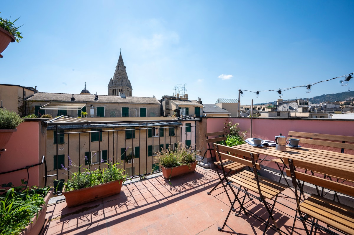 Bienvenue dans l'appartement avec une terrasse exclusive offrant une vue imprenable sur la Porta Soprana historique Lumineux, récemment rénové et situé au 2e étage avec ascenseur dans un bâtiment historique Vous trouverez un matelas Dorelan avec surmatelas, une cuisine entièrement équipée, une salle de bain spacieuse et tout le confort Idéalement situé, entre ancien et moderne, vous apprécierez l'âme authentique de Gênes : centre historique, art, bars, restaurants et transports en commun. Nous sommes impatients de vous accueillir 💚