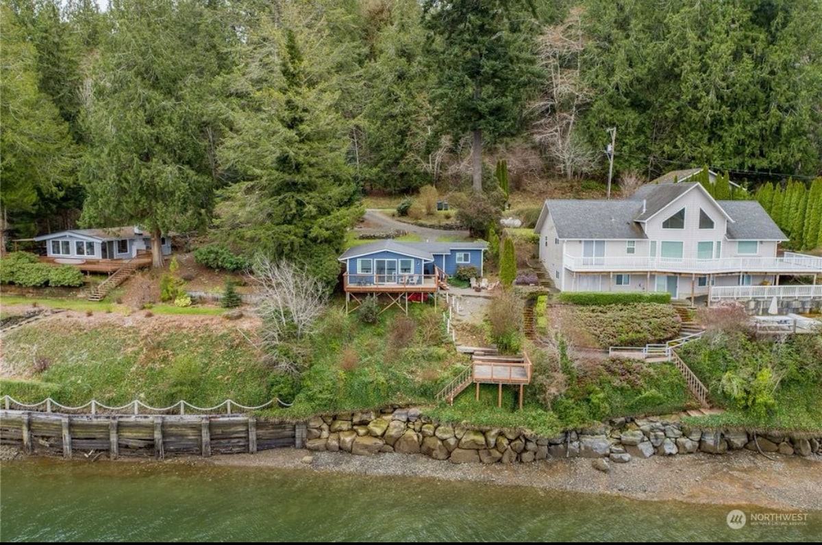 Cabane confortable d'une chambre à Burns Cove. Profitez d'une vue magnifique sur l'eau et la faune depuis la terrasse environnante. Par temps froid, blottissez-vous près du poêle à bois et savourez la solitude. Les voyageurs apprécient les forêts environnantes et le Puget Sound. Séjours de cinq jours minimum. 20 % de réduction pour 7 jours, 37 % de réduction pour 28 jours. Avec neuf ans de super voyageurs, nous n'ajoutons PAS de frais de ménage aux frais !! S'il vous plaît, seulement des non-fumeurs et des non-vapoteurs. Merci ! Stet et Lynne