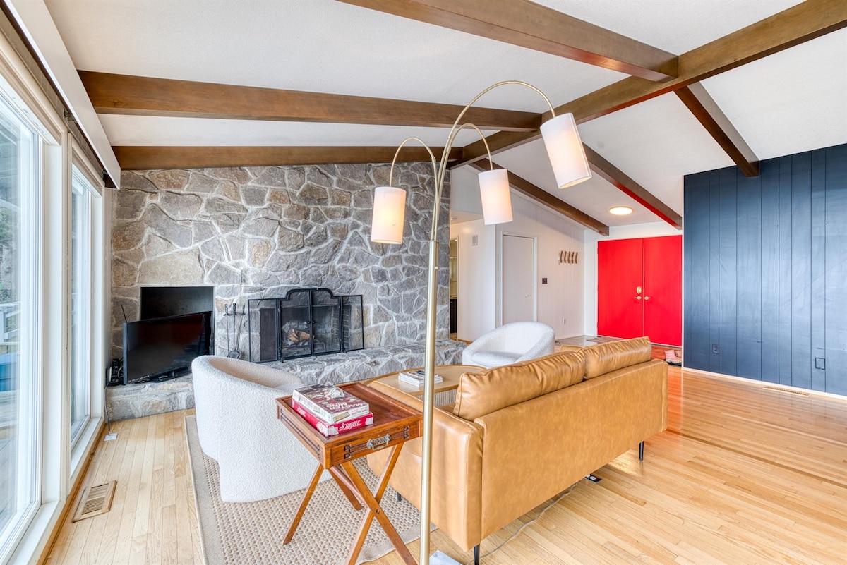Cabane pittoresque du milieu du siècle... avec votre propre rivière privée ! (Comme vu sur Magnolia Network « Cabin Chronicles »). Bénéficiant d'une vue magique sur d'immenses arbres forestiers et 300 pieds de rivière, profitez d'un intérieur soigné avec des appareils électroménagers modernes de luxe et une connexion Wi-Fi rapide. Imprégnez-vous de la vue incroyable sur notre vaste terrasse avec un verre de vin, allumez un feu de camp sur la plage de galets privée. Profitez de la pêche/baignade juste devant votre porte ! @rivercabaan | rivercabaan.com