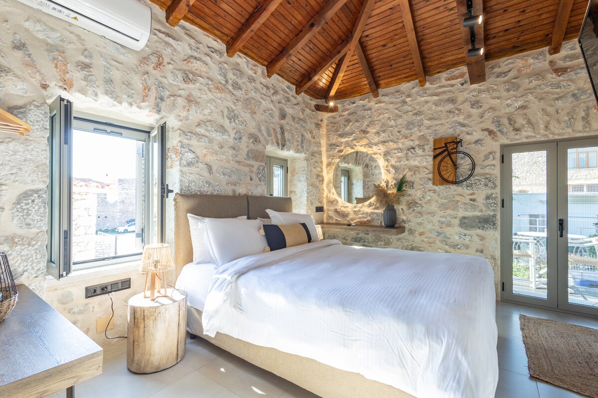 Détendez-vous dans cette petite maisonnette unique et tranquille de 2 étages, située dans un immeuble vieux de 200 ans. Nous avons réaménagé et rénové ce qui était autrefois les salles de stockage du bâtiment en une suite moderne et spacieuse de 2 étages reliée par un élément architectural Maniot appelé Katarraktis, un escalier étroit taillé dans les murs de pierre. La chambre est située au 1er étage et la salle de bains se trouve au rez-de-chaussée. La suite dispose d'un balcon avec vue sur la mer et d'une immense salle de bain avec douche italienne.
