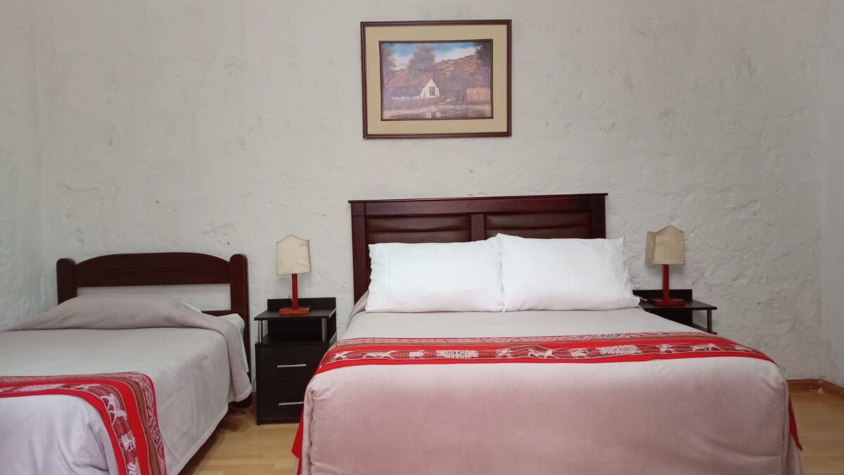 Chambre confortable avec vue sur la terrasse. Elle offre une ambiance charmante, au cœur d'Arequipa. - À 10 min à pied de la place principale et du marché San Camilo. - À 7 minutes à pied du monastère Santa Catalina. - À 3 min à pied de San Lazaro, San Francisco, des magasins et des restaurants traditionnels. La chambre comprend une salle de bain privée équipée de savon, de shampoing et de serviettes. Un petit-déjeuner sain est inclus, et tout au long de la journée, vous pouvez vous servir du thé et du café. Vous pourrez profiter d'une belle terrasse et d'un coin salon extérieur confortable.