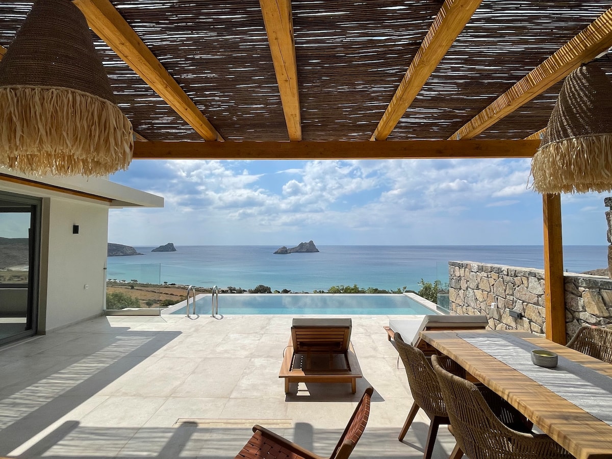 Profitez de vacances paisibles au bord de la mer ! Réveillez-vous le matin en admirant un lever de soleil unique depuis votre lit. Détendez-vous dans le jacuzzi extérieur, la piscine commune, les terrasses, en écoutant le bruit des vagues et le chant des oiseaux. La vue est magnifique de partout. Devant vous, le bleu infini de la mer de Crète, autour de vous, la nature crétoise impressionnante. La vue est à couper le souffle, que ce soit depuis les deux salons, les chambres, la salle à manger, la cuisine, les salles de bain ou la douche extérieure.