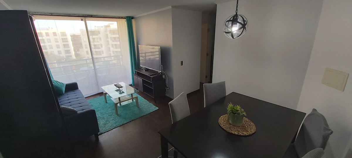 Departamento cercano a la playa, ubicado en el condominio portal del sol, 3er piso. El condominio cuenta con estacionamiento, piscina, cámaras y guardias de seguridad las 24 hrs. del día, el depto cuenta con 2 smart tv, 1 parrilla a gas . Se encuentra a 15min aprox en vehículo al centro de la ciudad.