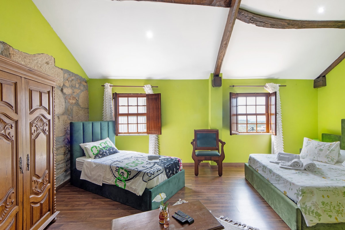 Only 8KM from Douro Valley lies another green enchanting valley lies a farm that once belonged to the cister order. Surrounded by an olive grove and a vineyard. In the Main house we carefully refurbished all the interiors & exteriors to keep authenticity but provide all the comfort of a modern house. Don't hesitate to stroll around the gardens & enjoy the infinite pool. The room is fitted with a king size bed that can be separated. A kitchenette, an office, TV, High Speed internet and a bathroom