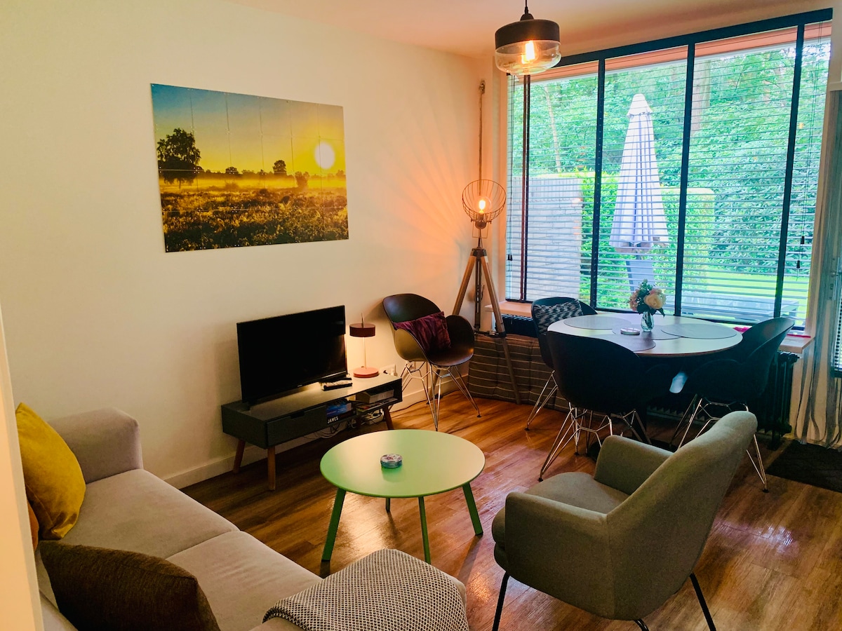 (Equipé d'une bonne connexion Wi-Fi et d'un Google Chromecast) En périphérie du village d'Otterlo et à distance de marche du parc national De Hoge Veluwe (Kröller-Müller), ma maison de vacances est le Gaai flamand, situé dans le magnifique parc naturel de Hoefbos. L'endroit idéal pour se détendre et profiter de la nature. Notre chalet a été récemment rénové, dispose de deux chambres (1 connectée au salon). Facilement accessible en transports en commun et en voiture et très adapté aux randonneurs et aux cyclistes.