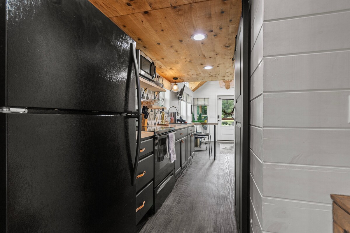 Moderne et minuscule avec tous les équipements d'un logement standard. Profitez de l'étang de pêche avec remise à l'eau ou asseyez-vous près du foyer lorsque toutes les lumières solaires et à cordes scintillent. Il est difficile de croire que vous êtes à seulement 5 minutes des restaurants et des magasins. Capacité d'accueil maximale de 4 au total, y compris les enfants et les nourrissons.