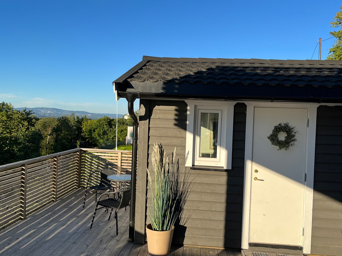 Annekset vårt ligger kant i kant med vakker natur. 45 min fra Oslo. Her kan du gå ut i skogen og få utsikt over Oslofjorden på to minutt. Få en minneverdig dag, med tur i skogen, grillmat på bålpanne og slapp av i Jacuzzi utover kvelden. Vi tilbyr: - fullverdig bad -140cm seng -kjøkken med utstyr -gratis parkering - 5min til buss -fantastiske utkikkspunkt rett inn i skogen. - Ved inkludert - Vi har varmepumpe/AC Vi er eneste nabo, og garanterer fred og ro.