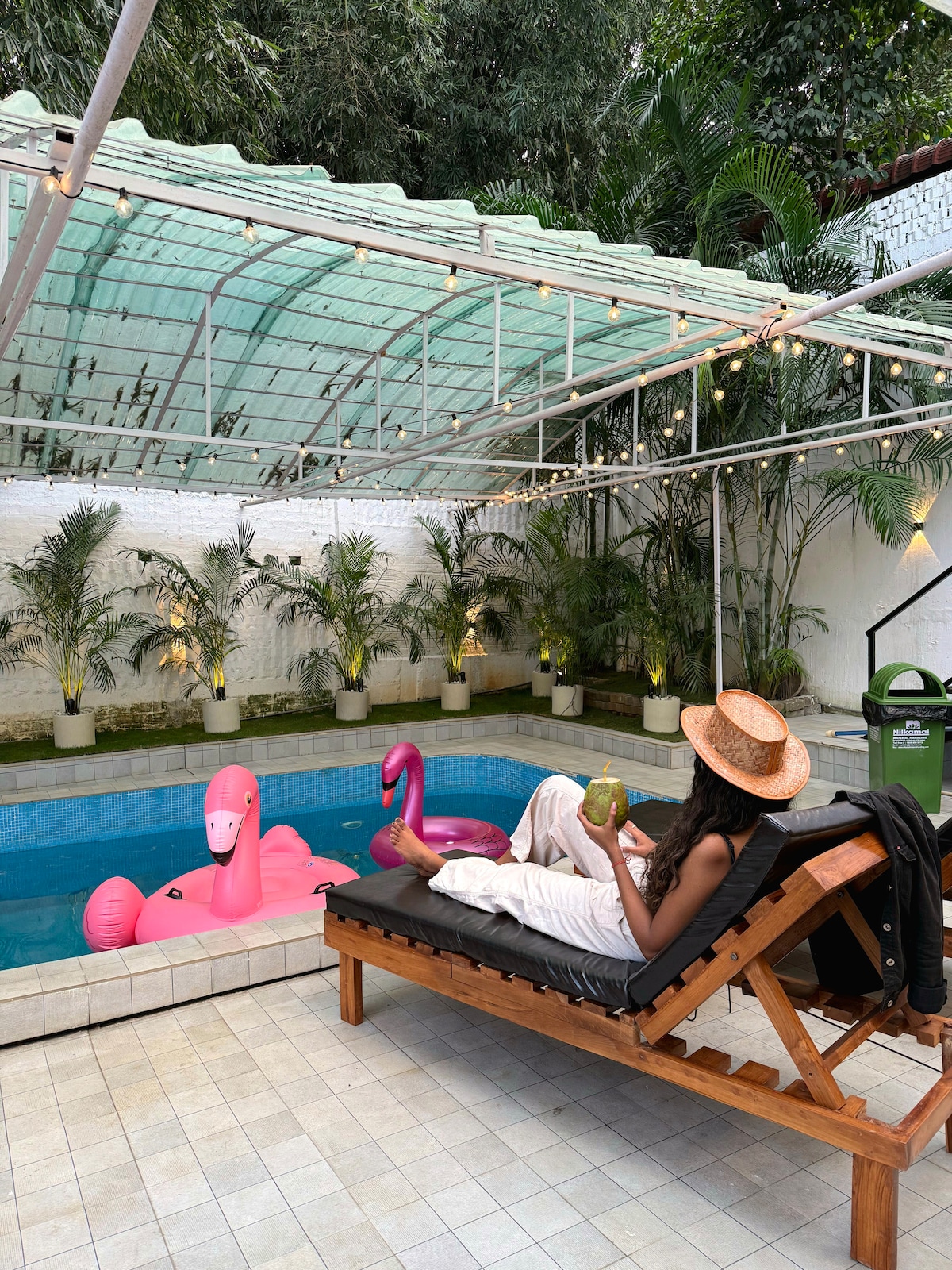 Palmera by GoHolidays is a lively 5BHK villa in Khanapara with a private pool, Goa-themed rooms, and amazing hangout spaces. Enjoy a sound-proof studio with projector for movie nights, two stylish 2BHK units for a tropical vibe, and a terrace with a swing and mountain view. The backyard pool, garden, bar counter, and loungers create the perfect spot to chill, celebrate, and make unforgettable memories.