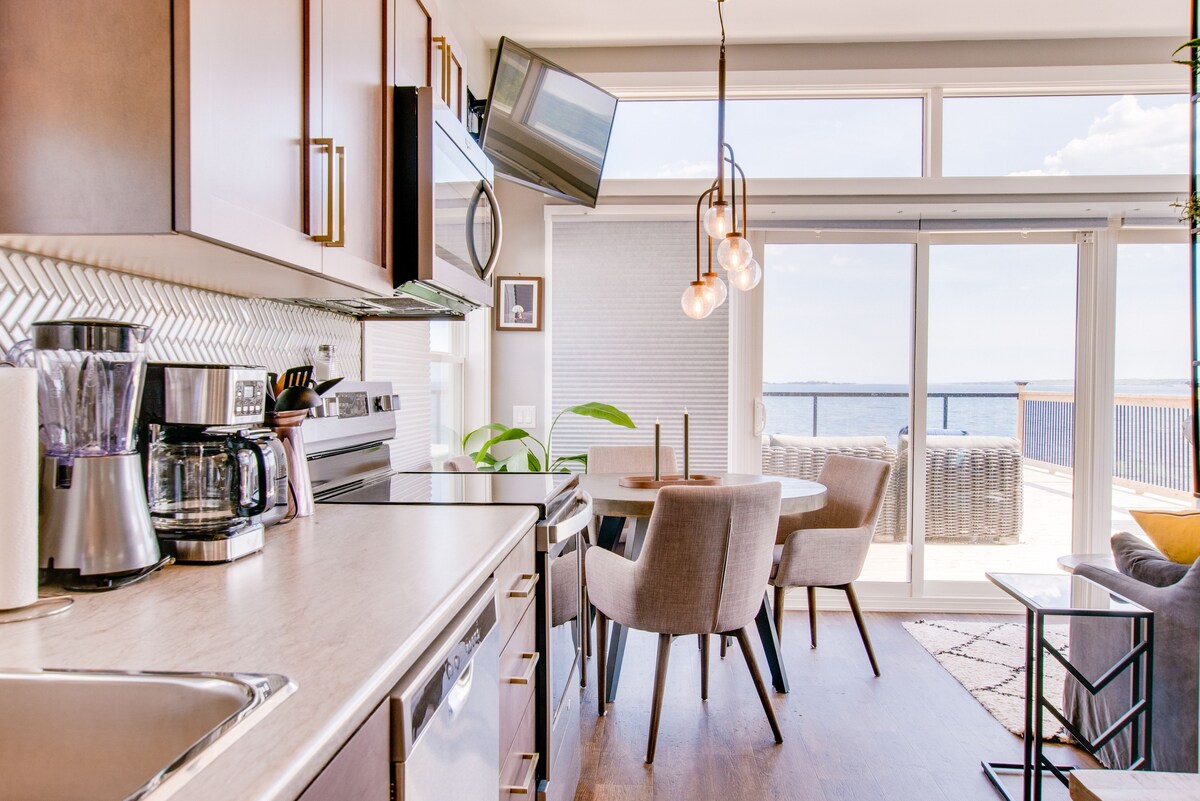 Le REZ-DE-CHAUSSÉE - Vue sur la mer ! Détendez-vous et profitez de cet espace moderne avec vue spectaculaire sur l'océan dans votre maison loin de chez vous. Tout l'appartement au rez-de-chaussée est un espace privé et séparé avec une cuisine complète, une salle de bain, une chambre principale et une chambre avec lits superposés pour enfants et une terrasse avec vue sur la mer ! Promenez-vous le soir le long de la promenade, explorez la ville ou détendez-vous confortablement devant Crave TV près de la cheminée. Wi-Fi ultra-rapide et produits de base tels que thé, café, sucre et certains produits essentiels fournis.
