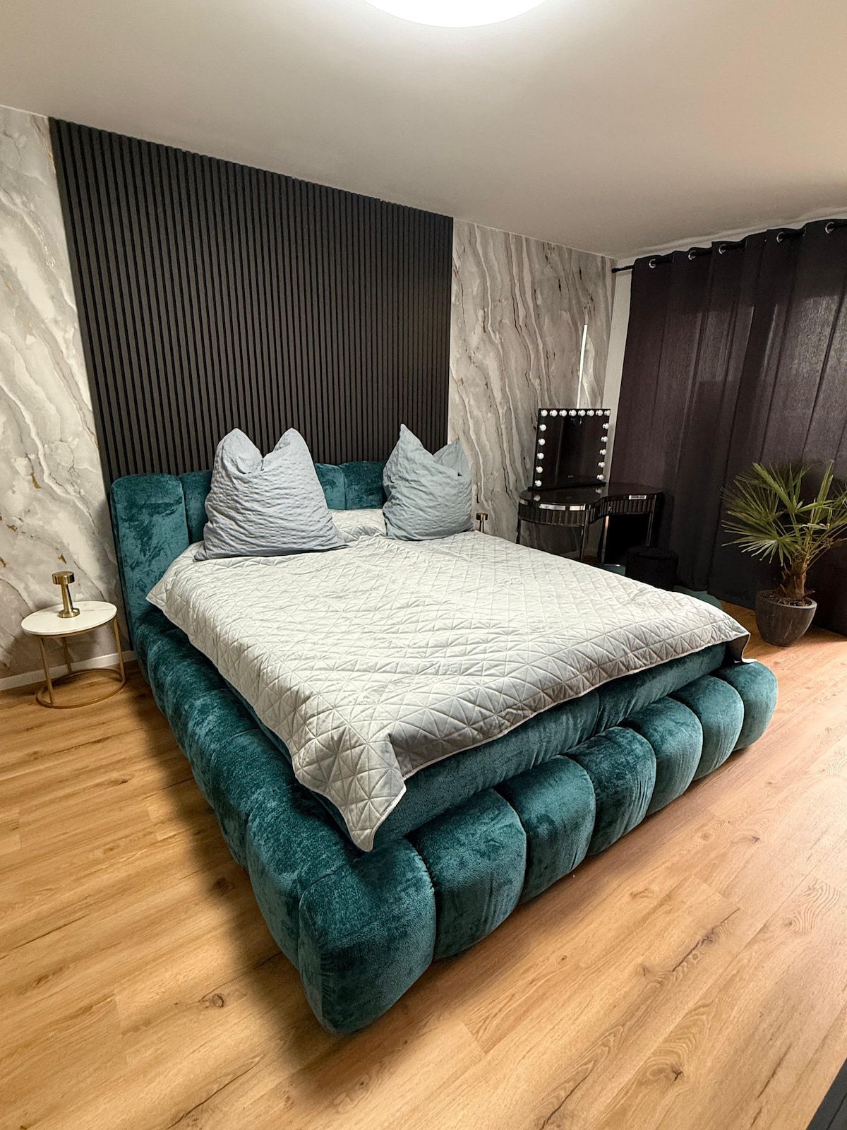 Dein Zimmer ist im Glamour Stil mit modernen goldenen Akzenten eingerichtet. Das 35m² Studio enthält ein BOXSPRINGBETT, SMART-TV mit gratis NETFLIX & WIFI, Küchenzeile + NESPRESSO und kostenlose Parkplätze. Das Appartement befindet sich im Hotelturm - Wahrzeichen & höchstes Gebäude Augsburgs, fußläufig in die Innenstadt (10/15 min) + zum HBF. Du wohnst in einer der höchsten Etagen. Genieße bei schönem Wetter den Blick über Augsburgs Alpen.