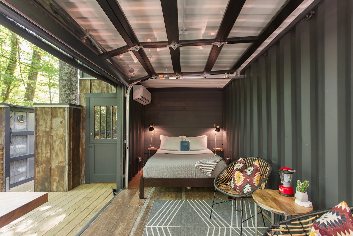 This modern, dog friendly retreat is a converted shipping container situated on our 125 acre mountain top forestry management land that backs up to Pisgah National Forest. Enjoy all the best hikes on the Blue Ridge Parkway just 4 miles away and then head 25 minutes into Asheville for all its amazing food, music, and beer. We provide the luxury of heat and air conditioning, with a little taste of being off grid with an outhouse and an outdoor solar shower bag. *4x4 or AWD is best*.