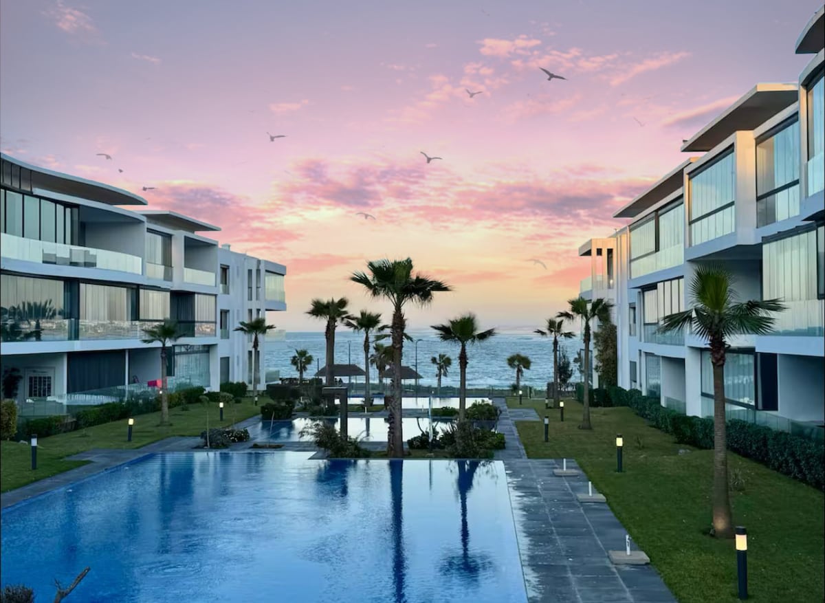 Modern 2BR duplex in Dar Bouazza Tamaris with beautiful pool views and full privacy. Sleeps 5 + infant. Includes 2 bathrooms, high-speed Wi-Fi (100Mbps), and a workspace. Enjoy 6 infinity pools, gym, game room, and direct beach access. Fully equipped kitchen with coffee machine, dishwasher, and washer. Perfect for families, friends, or remote work. Peaceful residence, modern decor, sunny and spacious — ideal for relaxing stays or fun getaways. Close to restaurants, cafés, and beach activities.