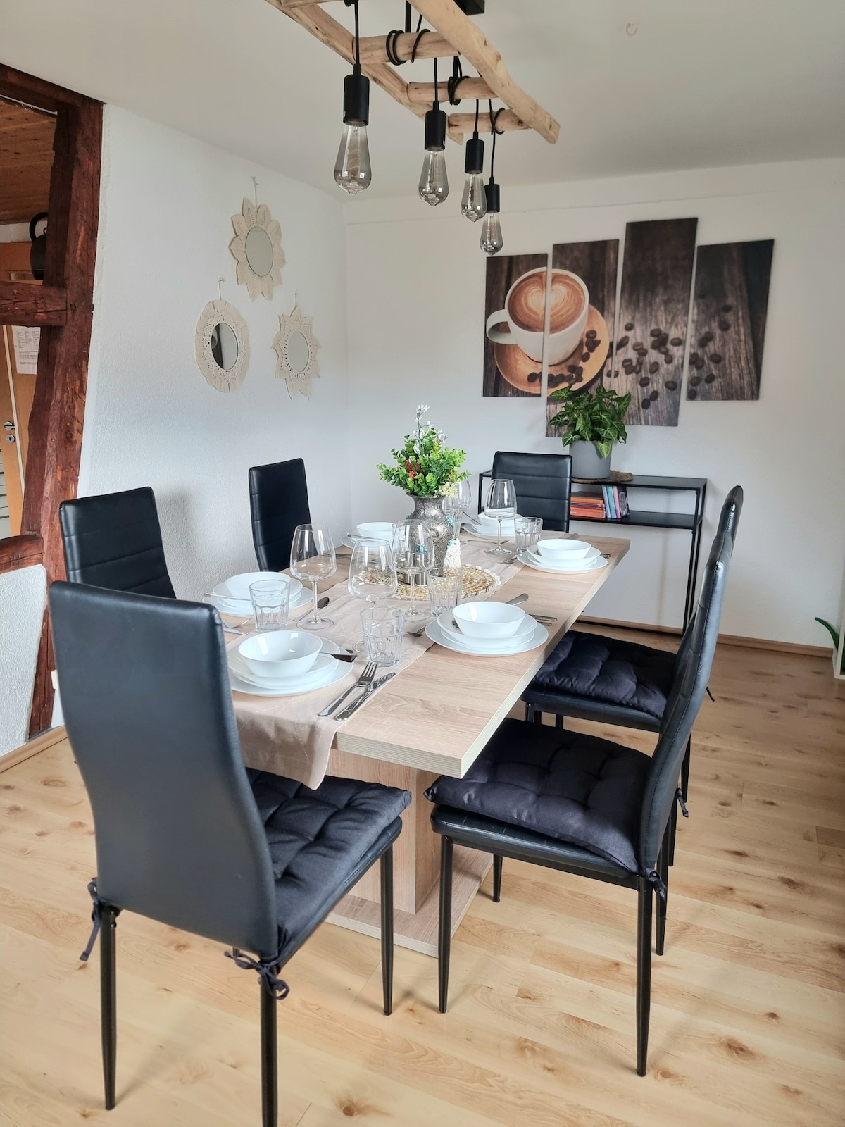 Wohnung im Erdgeschoß mit separatem Eingang und eigener Terrasse. Unsere Einrichtung ist in modern und Landhausstil gehalten.Sie verfügen über eine komplett eingerichtete Küche mit Kochinsel, einem großen Bad mit begehbarer Dusche. In der Wohnung befindet sich ein grosses Schlafzimmer mit einem Doppelbett in der Größe 180/200, zusätzlich befindet sich im Bereich des Wohnzimmers, eine ausziehbare Couch mit den Maßen 140/200.Alle unsere Betten sind mit Toppern ausgestattet. Handtücher vor Ort.