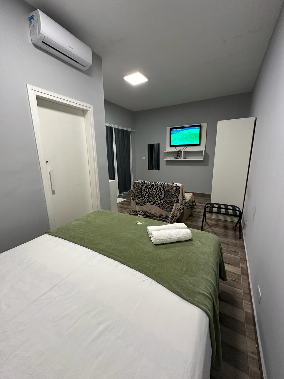 Café da manhã, Wifi, carregador de carro elétrico cortesia na hospedagem Taxa de turismo: R$ 3,00/diária ISS 3% incluso Diária por pet R$129,00 Estacionamento - R$ 25 por dia Quarto com decoração moderna equipado com: Ar condicionado quente e frio SmartTV led 32” Telefone Frigobar Caixa de som bluetooth JBL Camas box solteiro Espelho de corpo inteiro Ampla janela com blackout duplo Enxoval de primeira linha Ducha com aquecimento central Ducha higiênica Secador Amenities biodegradáveis